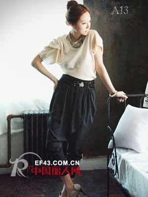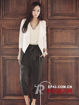 粗腿MM在选择九分裤上也要注意颜色与款式的搭配。黑色是最显瘦的颜色了,垂坠的质感加上宽松的剪裁,从腰部开始的皱褶完全遮盖了过宽的胯骨与大腿,搭配一件丝质白色上装,轻盈的妩媚感立刻显现。