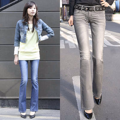 喇叭裤,现代裤类名称。所谓喇叭裤,因裤腿形状似喇叭而得名。它的特点是:低腰短裆,紧裹臀部;裤腿上窄下宽,从膝盖以下逐渐张开,裤口的尺寸明显大于膝盖的尺寸,形成喇叭状。在结构设计方面,是在西裤的基础上,立裆稍短,臀围放松量适当减小,使臀部及中裆(膝盖附近)部位合身合体,从膝盖下根据需要放大裤口。按裤口放大的程度,喇叭裤可分为大喇叭裤和小喇叭裤及微型喇叭裤。喇叭裤的长度多为覆盖鞋面的长度。小喇叭的裤脚口比中裆略大,约在25厘米左右。大喇叭的裤脚口,有的竟在30厘米以上,穿着后象把扫帚在扫地。穿着牛仔裤都想穿出修长的效果。不同体型的牛仔裤穿着,有着不同的技巧,运用得当便可以穿出意想不到的效果来。