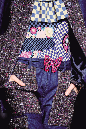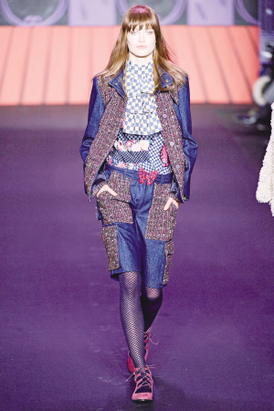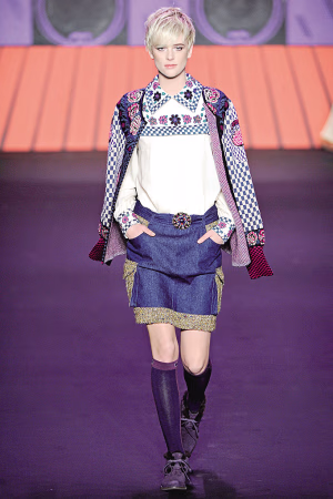 有人说Anna Sui复古,有人说Anna Sui绚丽,更多人的看法是Anna Sui还活在为洋娃娃设计服装的少女年代,总是在不经意间流露出天真烂漫的少女情怀。在2011春夏系列,Anna Sui用充满童话色彩的针织花纹、碎花拼布和蝴蝶结,将硬朗的牛仔短装变成可爱的“娃娃装”,让一众“娃娃控”们爱不释手。