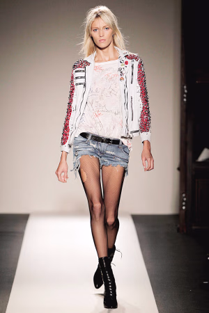性感的牛仔短裤是夏天一道风景,不过拥有法式浪漫血统的Balmain显然对性感有更深刻的理解:性感并不是流于肤浅的“短,再短”,若隐若现的曲线诱惑才是棋高一着。在2011春夏系列上,Balmain用朋克式铆钉磨边牛仔短裤加破洞黑丝的搭配,为本已高温的夏天再添一丝热辣。