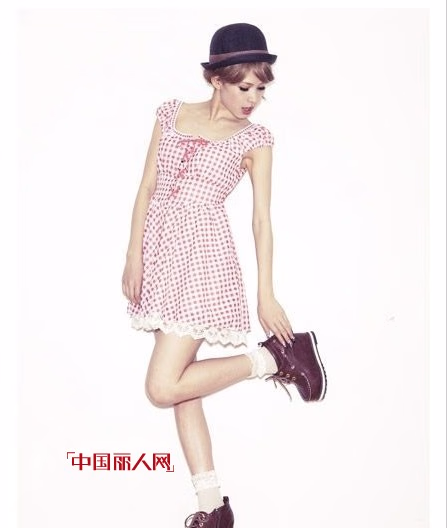 红白小格子,美式乡村风的经典图案,配上蕾丝花边女孩子气十足,短袜和圆顶礼帽的搭配增添复古感觉。