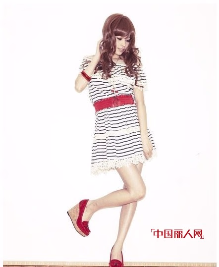 海军条纹配上复古风的一字领设计,红色的腰带和高跟鞋有加分哦!