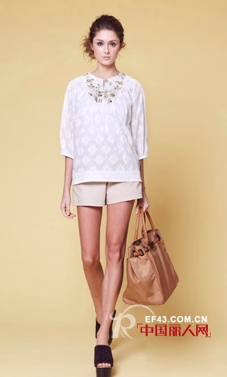 米色阔裤短裤,简单素洁,给人舒适的纯净感,搭配白色提花衫,清爽又显女性柔美。