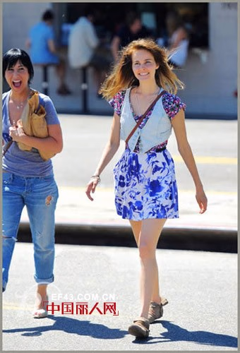 小编点评:Alyson Hannigan就是最新肥皂美剧《老爸老妈浪漫史》(How I Met Your Mother)中饰小个子莉莉的那位可爱妞儿!她这次的亮点是用多条佛珠的项链搭配基础款T恤牛仔裤,花朵平底鞋是很常见的款式,这样搭配非常清新。