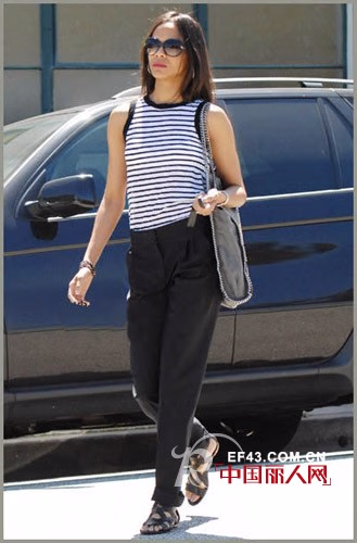 小编点评:Zoe Saldana的街拍呈现出干净利落的风格,她这次带来的是横格纹简单背心与OL风格“萝卜裤”的组合搭配,这位好莱坞颇受瞩目的拉丁美女生就一副衣服架子,消瘦的身形加之自内向外散发的强大气场,什么服装穿在她身上都好看。