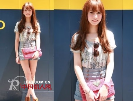T恤和高腰牛仔裤的搭配很经典,编织手拿包是亮点,甜蜜蜜的蜜桃派哦。