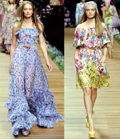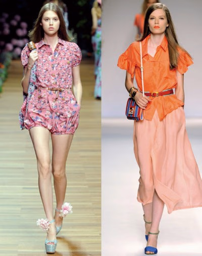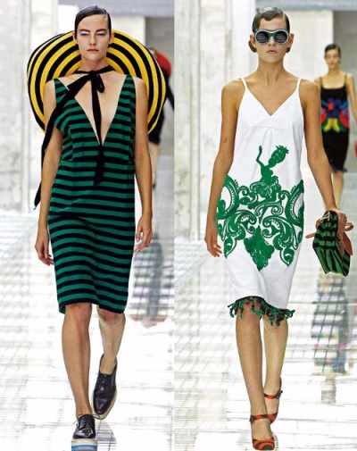 PRADA2011早春度假系列女装运用了丰富飞色彩,荷叶边装饰于领口或者袖口的印花裙搭配彩色长袜、高跟鞋、手环、耳环等配饰,呈现浪漫的田园风格。