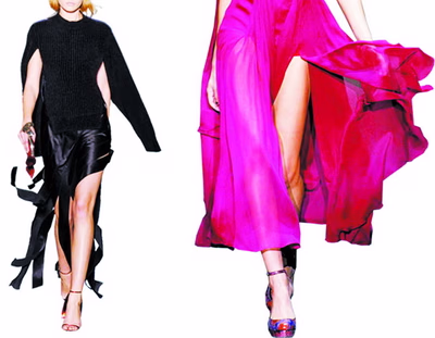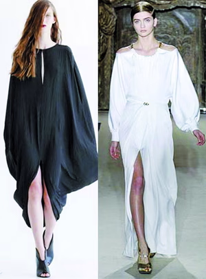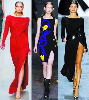 Dsquared2用巧妙的斜式剪裁,乍泄了女性大腿根部的风光,并让模特露出紧实笔直的长腿,充满了罗马雕塑般的美感。而Hussein Chalayan最有趣,除了在裙摆上神来一刀的开叉外,更重演了上海滩旗袍几十年间趋势——“长了改短,短了加长”, 或而长及地面,连鞋子都看不到;或而短至大腿,叫人遐想连篇。而英国设计师Christopher Kane则更进一步,学了顾兰君当年那一招,从袖口开了个大叉,一直蔓延至腋下,这无疑会叫人津津有味地产生许多丰富联想,而他本人也坦白其出发点:“这源自于对不正经少女的幻想。”
