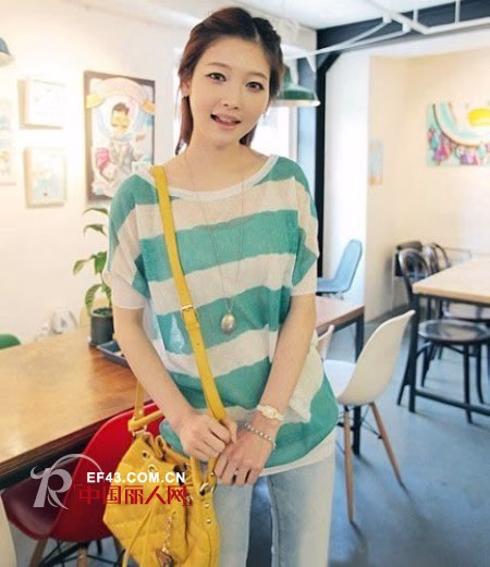 清雅条纹配色短袖针织衫,略带蝙蝠袖的版型修身效果很好,稍显透视的设计将女人的性感魅力凸显而不张扬,宽松的款式,百搭更显瘦!