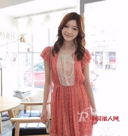 玫瑰碎花雪纺连衣裙,胸前的蕾丝拼接柔美而充满女人味!靓丽的西瓜红色在夏季很是抢眼夺目!很适合娇小甜美范的MM噢!