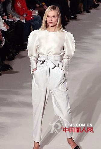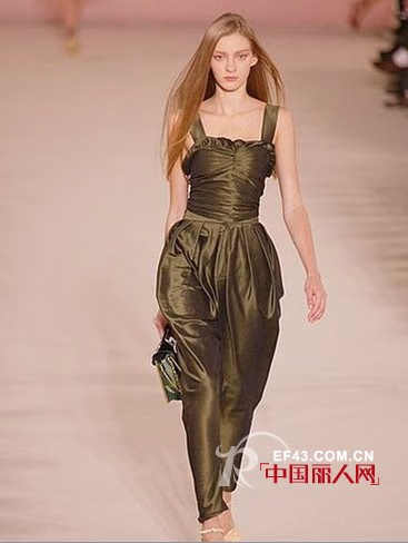 2009春夏系列的很多设计可圈可点:丝光面料的上衣配上萝卜裤下装,再加上荷叶边修饰,亲切又迷人。 圆边修饰弱化了利落感觉,营造出浓浓的女孩感觉。