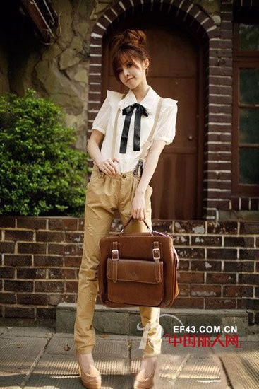 基本款飘带衬衣+破洞卡其背带裤,衬衣特有的耸肩设计将MM的身材衬托地显瘦而高挑,领口的黑色蝴蝶结丝带有着浓浓的学院感,再配上大大的公文包,超有feel和气场的噢!