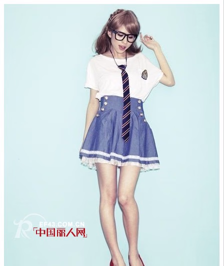 海军学院风最适合夏天了,清爽又舒适。白色T恤非常干净,简单的徽章点缀和领带的搭配,变得可爱起来。高腰的牛仔短裙,海军元素之外注入浪漫蕾丝。
