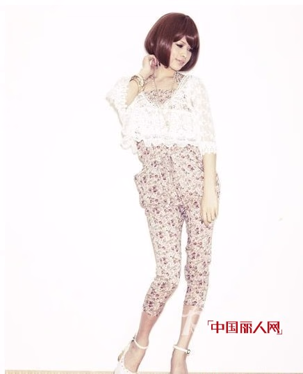 碎花连身裤从去年流行到今年,与蕾丝罩衫的搭配,很有时髦感。
