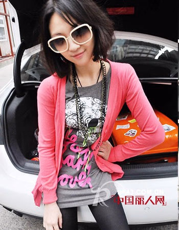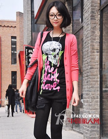 换一种颜色的开衫是不是感觉就不一样了呢?西瓜红色和T恤上的粉色字母交相呼应很有粉嫩的摇滚风哦!