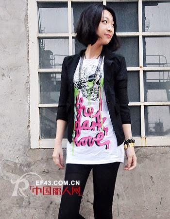 白色的T恤多了分明媚搭配黑色小西服真是首选哦长款的T不需要打底裤直接丝袜很性感哦!配合系、雪纺西服的气质又干练又性感还很时尚哦!