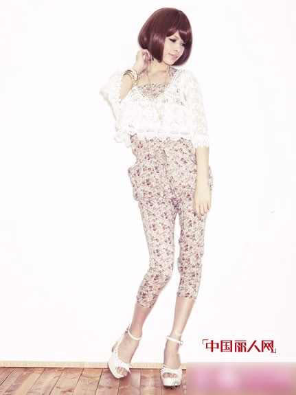 碎花连身裤从去年流行到今年,与蕾丝罩衫的搭配,很有时髦感。