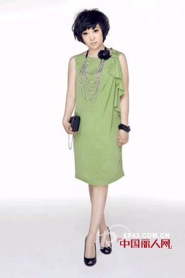 搭配看点 简洁优雅的粉绿色,成熟而细腻。看似简单的线条和巧妙垂坠的荷叶边装饰,通过立体剪裁让A字筒裙看上去更为合体和富有造型感。层叠的夸张装饰项链是点睛之笔,流线造型和衣装完美结合。精致的手包、复古的木质手环,点点滴滴都透露着蓝色性格的沉稳与优雅。