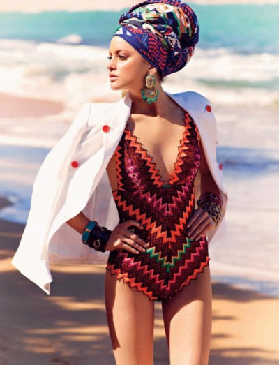 今季的沙滩可谓是多姿多彩,全部都依仗泳装设计师们的奇思妙想,才能将海边沙滩风情渲染得五彩缤纷。来自时尚杂志《VOGUE》俄罗斯版5月号刊物,为我们展现了具有民族风设计的泳衣系列。大量阿拉伯原始土著的图案被作为灵感“移驾”到泳装上,极具复古色彩。模特再配上阿拉伯女性的帽子,更加相得益彰。