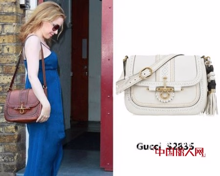澳洲天后这一身清凉的装扮因为这一款Gucci的精致单肩背包而显得格外不一样。细节处的刺绣与流苏非常讲究,足见品牌魅力。