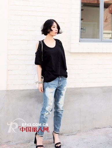 肩膀开口设计的T恤,时尚有魅力的一款T恤,前后的面料不透,前面看起来不透,后面比较透,肩膀开口,开口周围是铆钉装饰,个性的黑色,很出挑哦!