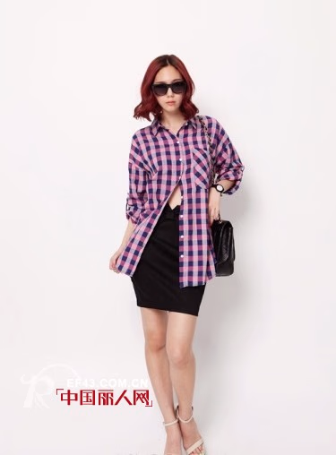 长款格纹衫颜色十分跳跃,款式又显大气,搭配小筒裙作为通勤装也未尝不可,这样只系几颗扣子的穿法够性感火辣吧。