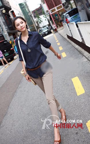职场通勤一族最常用的装备就是衬衫和裤装,但是刻板的职业装束缺少休闲感和女人味,细节的处理就显得尤为重要。裤脚和衣袖挽起,稍稍露肤才是初秋穿衣的要领。棕色系露趾鞋,稳重又不是俏皮感;腰带的装点,不仅起到很好的承接作用,还跟鞋子很搭呢。