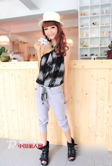吊带设计风格的雪纺衫,经典的黑白色彩,显露出复古的怀旧气息,脖后的吊带设计,呈现出性感的韵味,搭配纯色的修身裤,松紧的裤腿,塑造出轻松的休闲造型,淡淡的色彩,给人以浪漫的感觉,塑造出摩登的时尚造型。