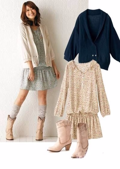如果您的腰腹有些小赘肉,不妨试试这样一款低腰的碎花连衣裙,腰部宽松的褶皱设计刚好可以遮住多余的肉肉。这样长度的碎花连衣裙,小编推荐带有蝙蝠袖的针织开衫,修饰身材又淑女气充足。短靴与长袜这种富有层次感的组合也很合适与这款单品搭配。