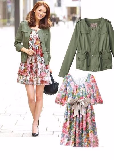 大朵的花朵元素层层叠叠,组成的印花更大方,这样一款碎花连衣裙花团锦簇,穿着在身上格外抢眼甜美。如果觉得这样的单品太过花俏而高调,不如搭配上一款军装风的外套。硬朗与柔美的组合,可是非常流行的搭配。