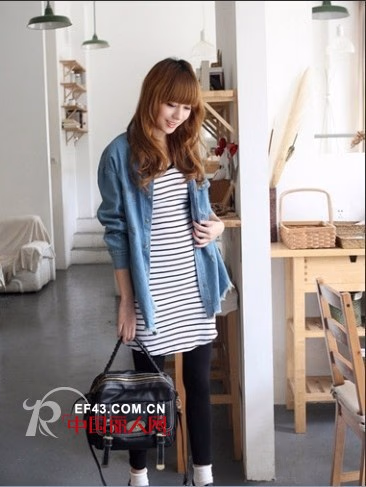 黑白横纹长T颜色搭配经典,过臀设计帮你掩饰住臀部和腿部的小小不足,搭配上一件下摆有做旧设计的牛仔衫,透露出几分复古的感觉。
