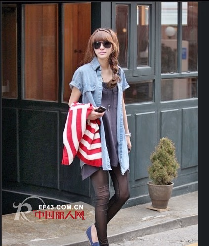 轻便的长款牛仔衬衫搭配长T和黑丝穿,更显出清瘦高挑的身材,这样的搭配最好选择同样轻便的平底鞋,会更有清爽甜美的感觉。