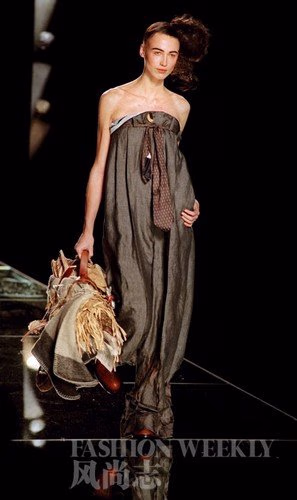 高级定制象征着尊贵与奢侈,然而以流浪汉为缪斯的华服将怎样保持其骄矜的姿态?John Galliano高举颓废主义的旗帜,声称在每日例行的晨跑过程中,塞纳河畔比比皆是的流浪汉令他颇受启发,于是他用“衣衫褴褛”的颠覆性主张定义高级定制,这令一向鼓励冒险的巴黎都有些噤若寒蝉。服饰看上去极度伪劣,宽松肥硕的裤子毫无比例可言,大面积撕扯、磨损、蛛网、烟头破洞等细节模拟得惟妙惟肖,迷你尺寸的餐具、空酒瓶肆意地悬挂在身上,但用料仍旧顶级,“污渍”实则是修剪整齐的羔羊毛,皮革拼接织锦缎以及高度精密的蕾丝刺绣形成了破衣烂衫的杂乱效果,看似随意扎在堆砌雪纺外的腰带则采用了 鳄鱼皮材质。在这个系列里,Galliano试图回望自己的过去,将性、浪漫、挑衅等毫无关联的元素杂糅在一起,与他的早期作品颇为相似。这或许也是Bernard Arnault雇佣Galliano的原因:破除传统,制造颠覆,不疯魔不成活。