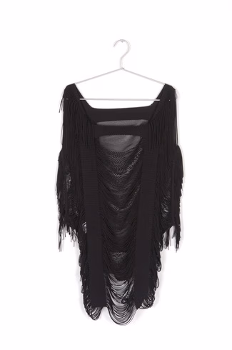 Toga的设计在高级时装品牌云集的买手店里,无疑具有极高的可辨识度。同样使用毛皮、流苏、蕾丝、针织元素,其创造出的效果却全然不同。上个秋冬系列中,针织被用来铺就充满反叛精神的怪诞轮廓,其余的装饰素材则负责制造意外效果。感觉就好像一个surprise party,熟面孔都在,却每个人都不是其本该有的样子。春夏系列中,Toga则延续了对渔网素材的运用,这件将流苏织缀在网眼之上的one piece,足可代表“只要一件便可创造全身的style”的精神宗旨。长流苏照例说应该是今年70年代风潮的标志元素,渔网则早被Alexander Wang这类80后设计师用来打造他们心目中的grunge风。可惜Toga的长流苏与渔网,编织出的样貌却嵌不进以上两个框框。即便将自己的主展示场设在巴黎时装周,Yasuko Furuta仍是一副不跟随潮流,活在自己天地里的模样。