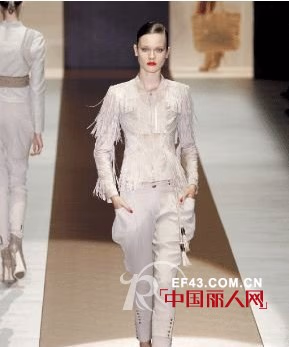 与其异曲同工的,则是硬朗的牛仔风格流苏。事实上,你很难用言语来形容它和嬉皮流苏的差别,如果硬要区分,大概是牛仔流苏大多使用皮革之类的材质,在长度和密度上都减弱了许多。但是,它们之间其实也有互通的可能,就好像是Gucci的流苏皮夹克,搭配T台上的马裤,极具西部牛仔的味道;但如果用来搭配碎花裙、喇叭裤等单品,你也可以说是嬉皮风格。这也正好说明了一点,流苏夹克其实比想象中的更好搭,不是吗?