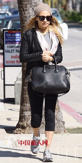 Nicole Richie携Céline Luggage手袋出街,十分惹眼。Simone出品的红色经典机车夹克,撞色效果刚刚好。