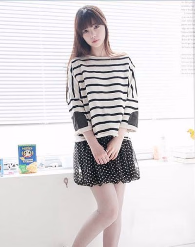 白色的条纹上衣很复古,宽松的版型挡肉肉的效果很棒,搭配一黑色波点的雪纺纱裙,甜美气质立刻散发出来。美眉们也可以搭配修身的上衣,将裙子变成高腰裙,会更显身材哦。