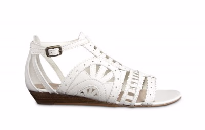嬉皮士的引入套用在崭新而女性化的演绎上,顿时幻化成时尚漂亮的修身窄脚高跟鞋,展现出野性的性感之美。别出心裁的镂空图案运用得恰到好处,流畅的线条使白色平底鞋更具假日味道。