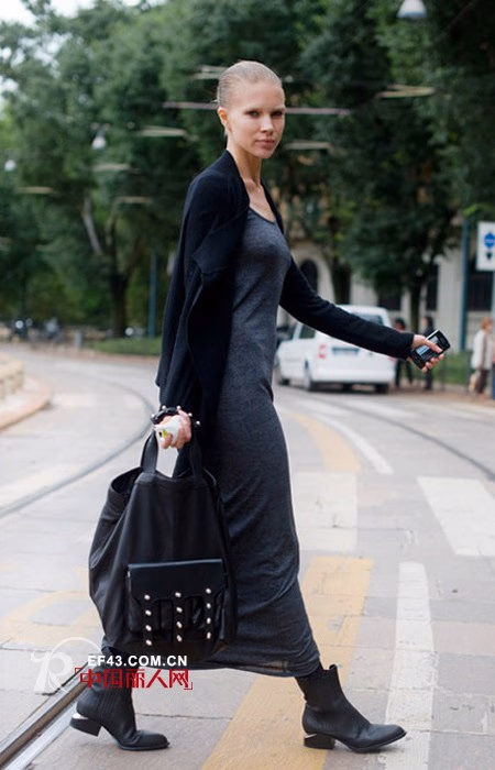 深灰色的连衣裙直至脚踝凸显了完美的身材,不过个子不够高的朋友还是不要尝试的好。