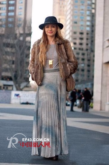 皮草搭配灰色百褶长裙更显优雅与贵气。
