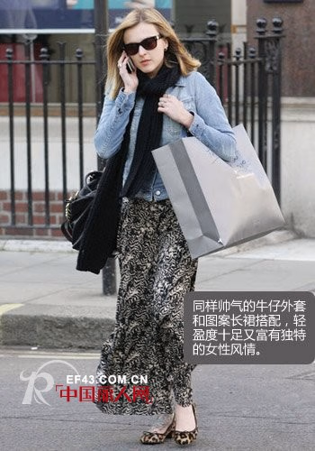 飘逸的裙摆若有若无的传递出迷人的女性风情,与率性的牛仔外套搭配的恰到妙处,豹纹平跟鞋更带出魅惑意味。