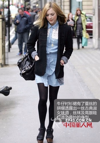 巧妙的蕾丝拼缀让率性干练的牛仔衬衫裙也有了不同韵味,丝袜及高跟鞋女人味十足并打造出曼妙的身线效果。