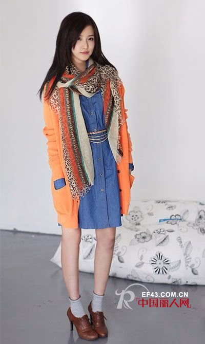 鲜橙色的针织外套加上牛仔连衣裙很有复古MM的Feel~搭配一些配件,如围巾,细腰带和及踝靴,复古味更浓~