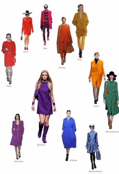 本季强烈如维生素药丸的色彩勾勒出一个简单的色彩轮廓。依据Pantone色卡,元素性很强,采用天蓝色、明亮的黄色、热情的红色、代表希望的绿色、粉红色,以及靛青和紫色。有一点非常重要,那就是要在全身使用色彩,从头到脚贯穿。我们应该记住这样一个事实,无论是七十高龄的设计大师Mary Quant 还是Pierre Cardin都曾使用这样的方法进行调色。毫无畏惧,敢于大胆尝试,通过高水平的色彩调和能力来征服世人的眼球。大胆尝试色彩是应该得到尊重的,与此同时也必须保证以简单轮廓作背景的简约性,采用清晰明了的结构,主张简约、朴素,这也是向时尚界的现代极简主义女前辈们致敬。