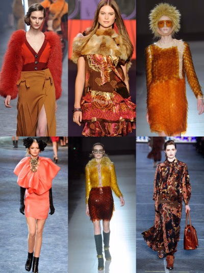 毫无疑问黄金色泽是下一个冬季时装的价值关键点。T台上美人仿佛是米达斯国王宫廷里的侍女。她们身着华丽、表面镀金的服饰,好像外星生物,被光线所遮蔽,一种强大而非自然的美。选择流畅的丝滑服装,闪着荧光,或者是偏爱混杂搭配的叮当声。川久保玲将黄金叶片作为装饰,以此塑造与刻画光芒四射的女性形象。也有设计师采用完全新的和不同寻常的比例,遮蔽腿部、躯干、头部,把自己囚禁在闪亮的头盔中,其中抽象的触角努力伸向光明。