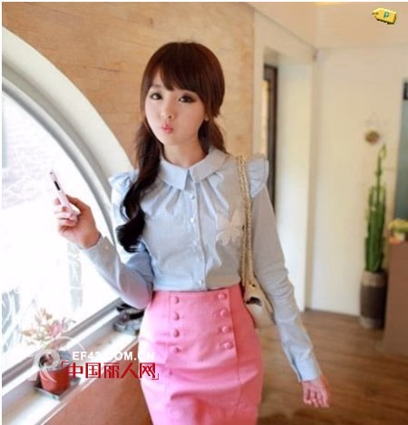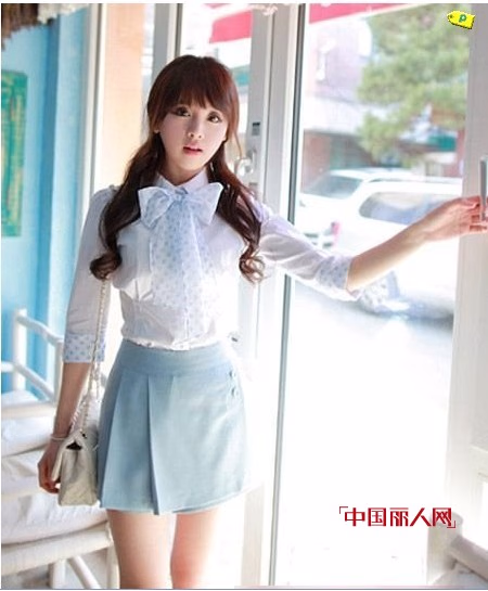 清爽俏皮的MM总是喜欢浅蓝色系的穿搭。白色衬衫 淡蓝色波点蝴蝶结述说着小女人的甜美气质,淡淡色彩铅笔裙让脸庞看其来更加清秀,减龄效果绝对赞!