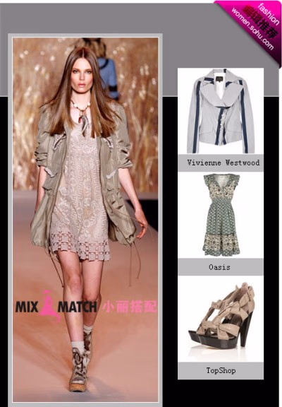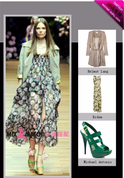 时尚解析:绿底粉花的组合给了我们暖暖的春意,繁花似锦让人心神向往。散发春日浪漫情怀的雪纺裙,完美的轮廓充满优雅气息。翠绿色的布质凉鞋强调出乡村的古朴气质,呈现出年轻女孩的淑女风范。