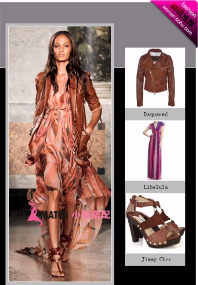 时尚解析:飘逸感十足的线条图案长裙,用雪纺材质衬托轻盈气质。荷叶边的设计秀出你的温柔气质,营造出邻家女孩般的清甜形象。野性的小皮外套的加入仿佛把你带入了热带丛林。
