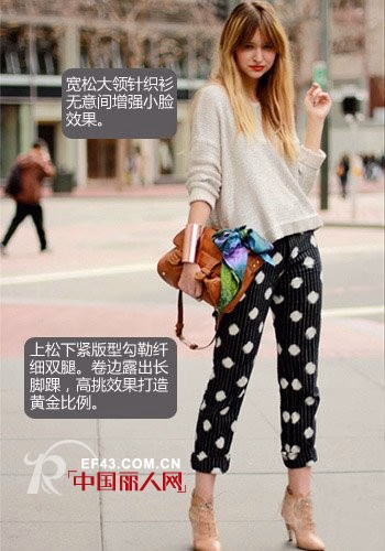 黑白波点视觉感超强,上 松下 劲版型勾勒纤细小腿不必担心过宽胯部。卷边露出长脚踝高挑效果打造黄金比例。休闲针织衫宽松领口显小脸。春天减肥有看点哦!