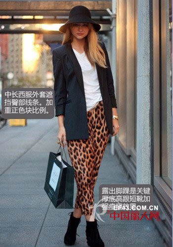春天就像穿出与众不同,豹纹裤装可以帮你一臂之力。中长款西装外塔可是本季春装火热单品,内搭基础款T恤简约时尚。下搭豹纹九分裤,毫无生硬感面加丝面料柔软舒适,上松下紧版型呼应外套长度,过宽胯部也被悄悄遮挡喽!选择豹纹单品时,搭配极简款式越能突出与众不同视觉感观。
